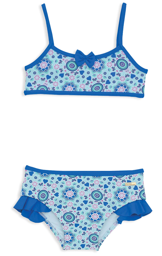 Azul marinho com babado em estampa rotativa floral. Top inteiro também com babadinho.