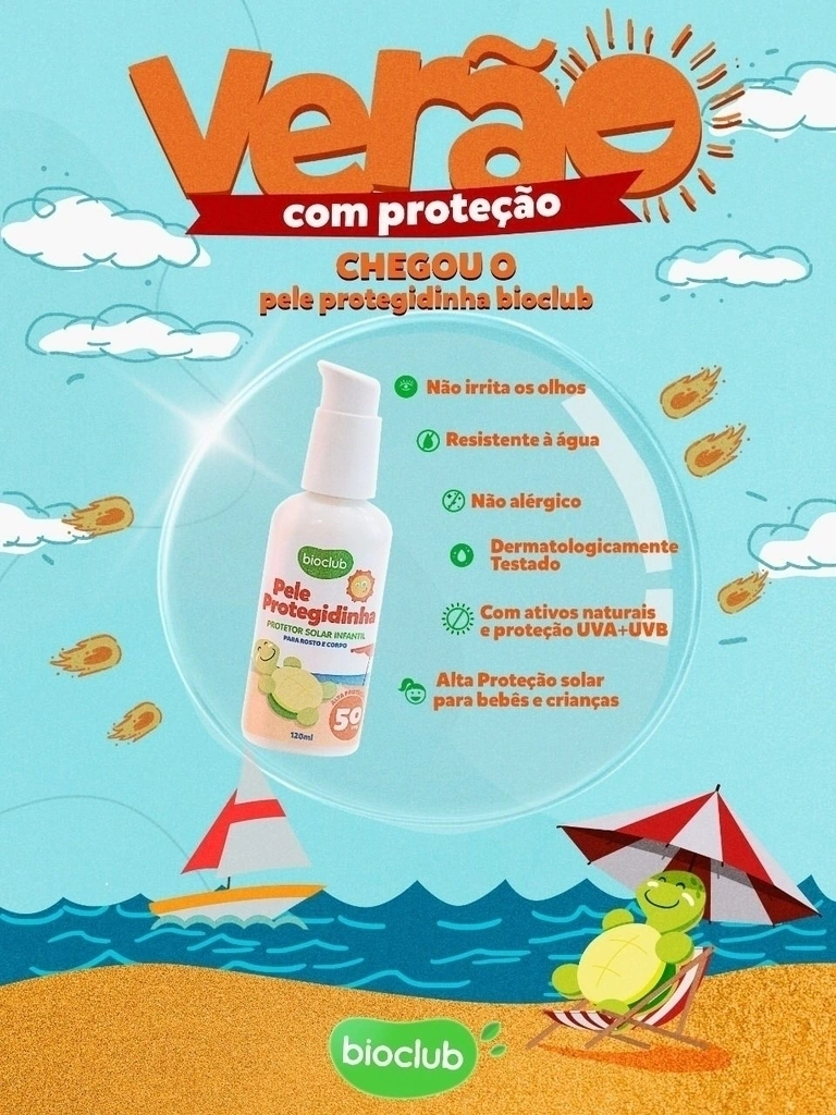 Para que você aproveite seu momento de lazer da melhor forma, criamos o Pele Protegidinha Bioclub®, que é o protetor solar perfeito para toda a família. Com FPS 50 e proteção imediata UVA + UVB, ele protege a pele do rosto e do corpo de queimaduras solares dentro e fora d’água. Um produto hipoalergênico resistente a água e suor, fácil de espalhar e com rápida absorção. Possui textura leve e não oleosa, hidratando e protegendo até as peles mais sensíveis.